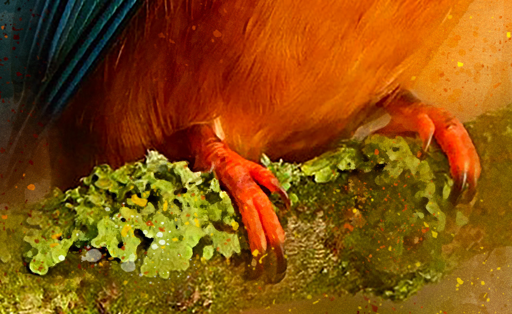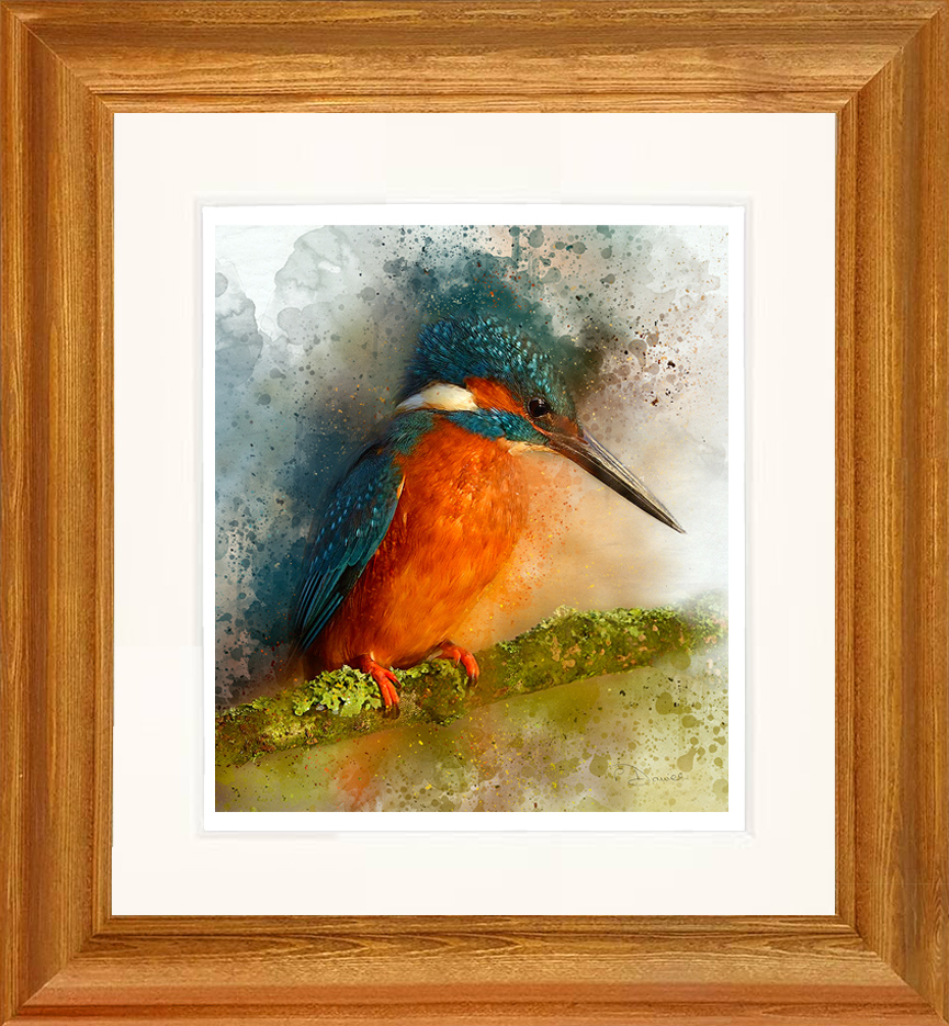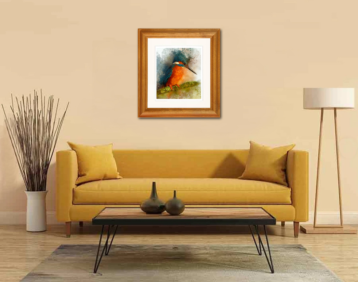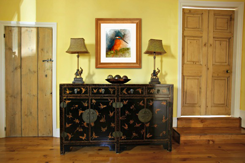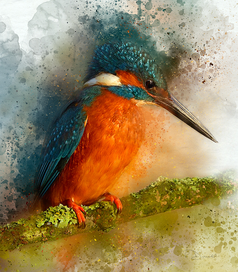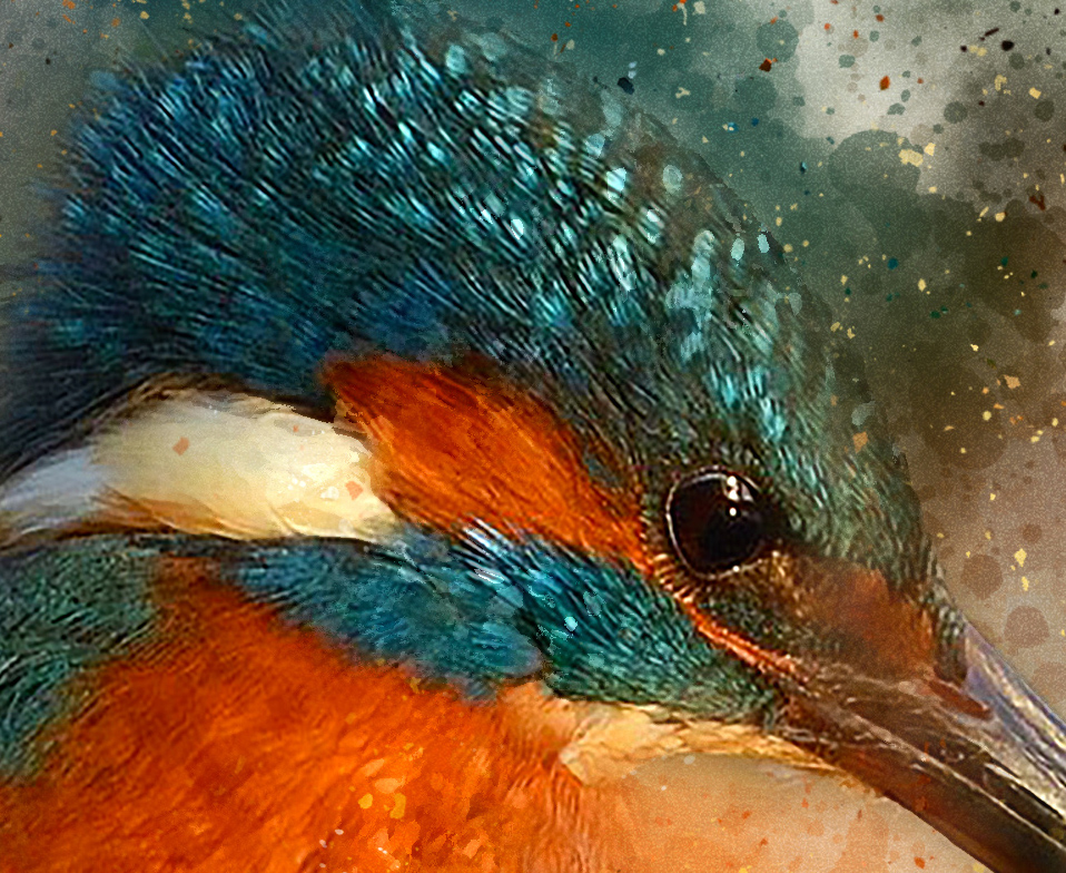 This painting captures the bird watching the water below, its colours bursting all around.